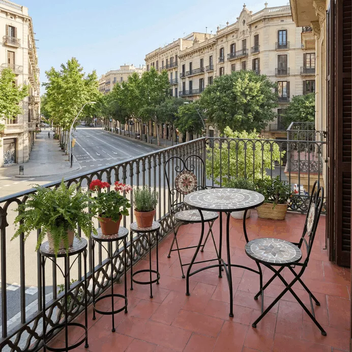 Doska stola je tvorená keramickou mozaikou v prírodných a teplých odtieňoch. Povrch je nielen esteticky pôsobivý, ale aj ľahko udržiavateľný a vhodný na vonkajšie použitie. Kovové nohy stola aj stoličiek sú tvarované do elegantných oblúkov a doplnené jemnými kovanými detailmi, ktoré podčiarkujú ľahkosť dizajnu a zároveň zaisťujú stabilitu.