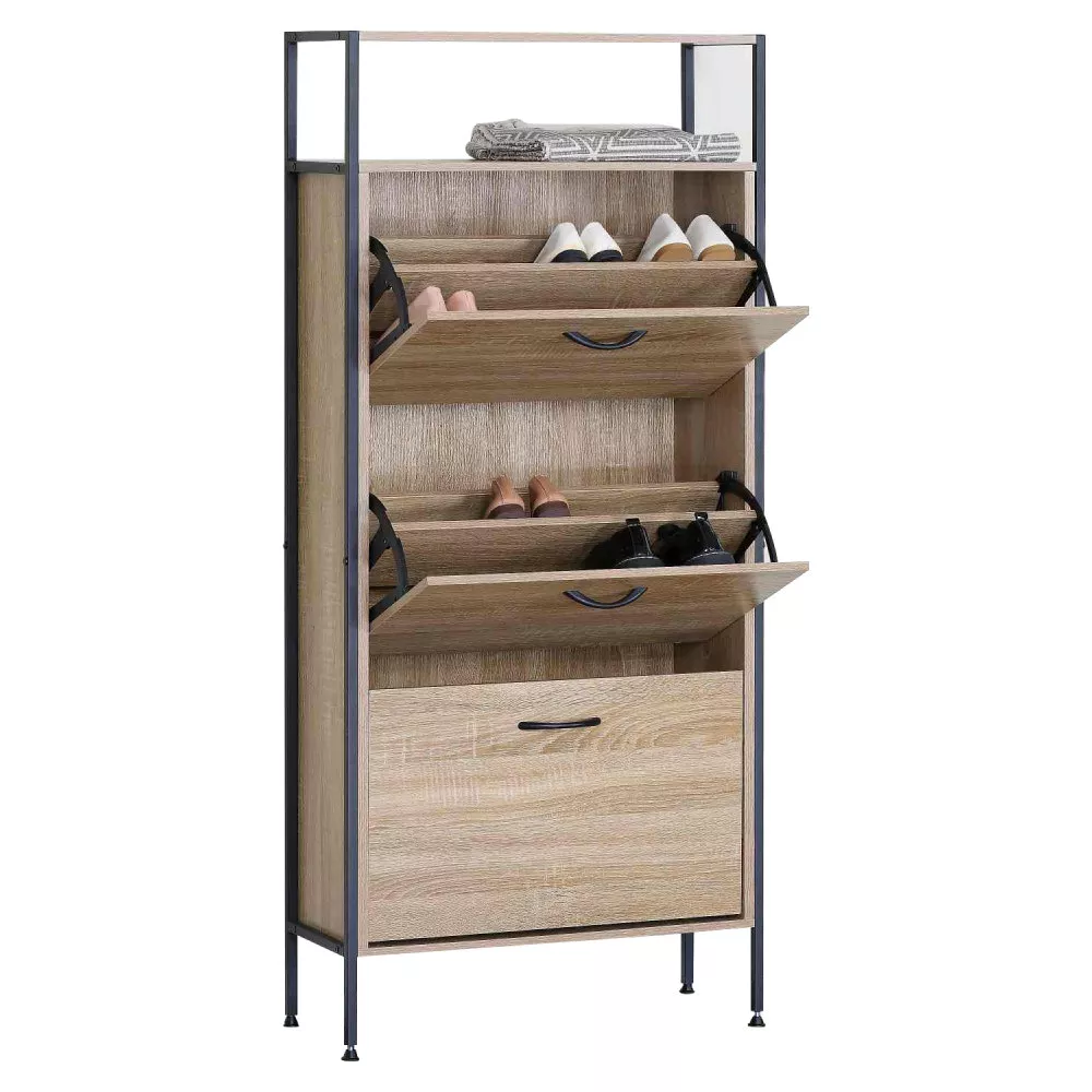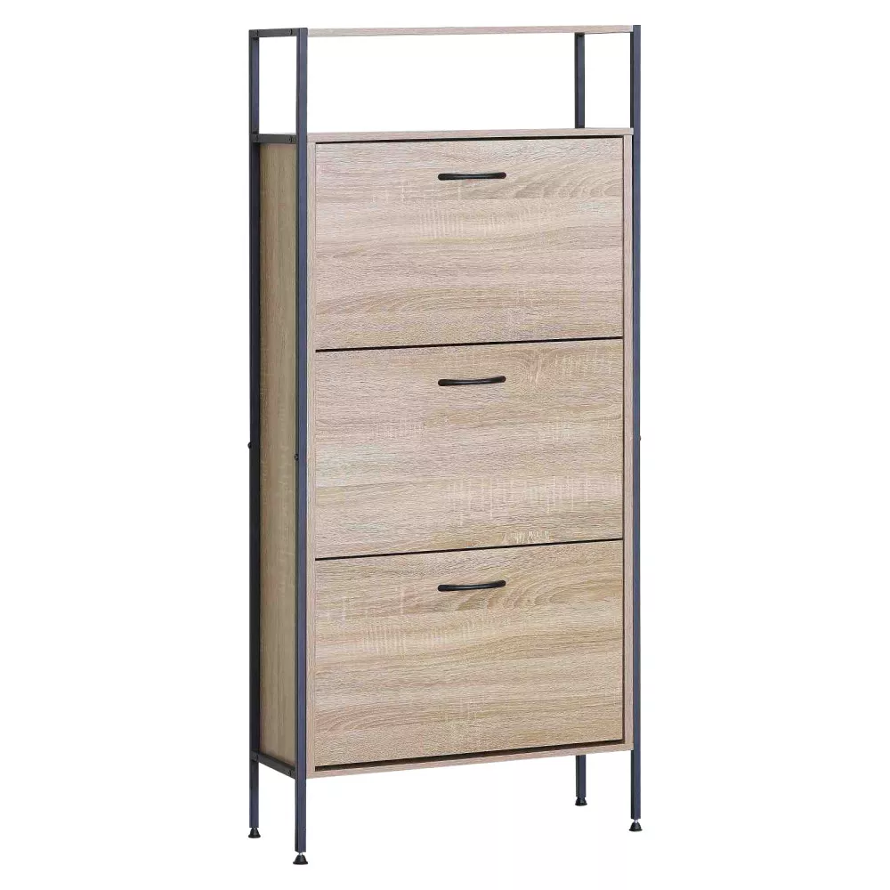 Botník je vyrobený z kombinácie drevotriesky a pevnej oceľovej konštrukcie, ktorú dopĺňajú plastové úchytky. Dekor dub v kombinácii s čiernymi detailmi pôsobí moderne a ľahko zapadne do súčasných interiérov. Minimalistický dizajn podčiarkuje čisté línie a funkčnosť.