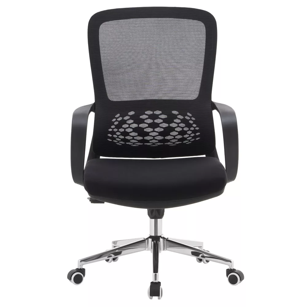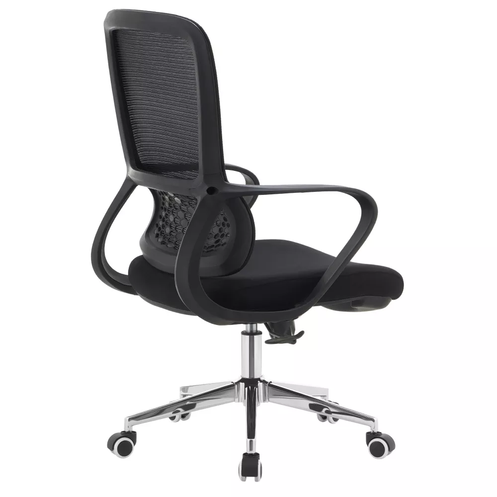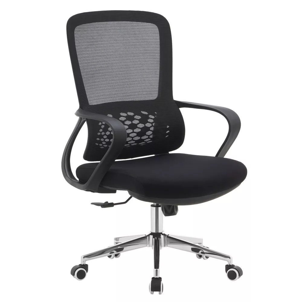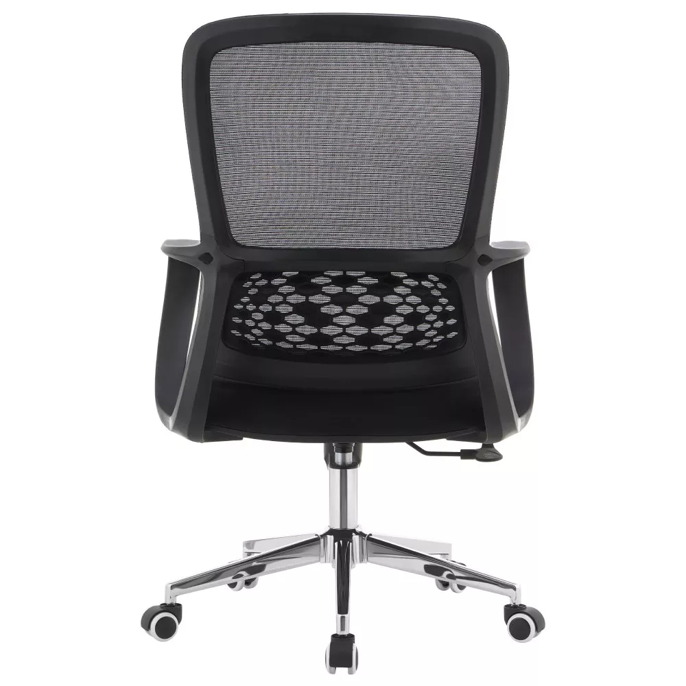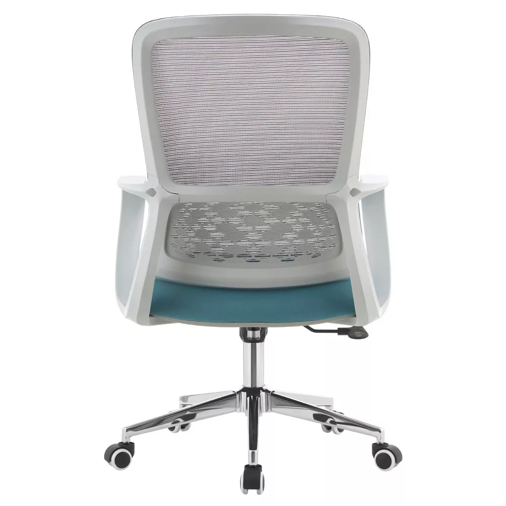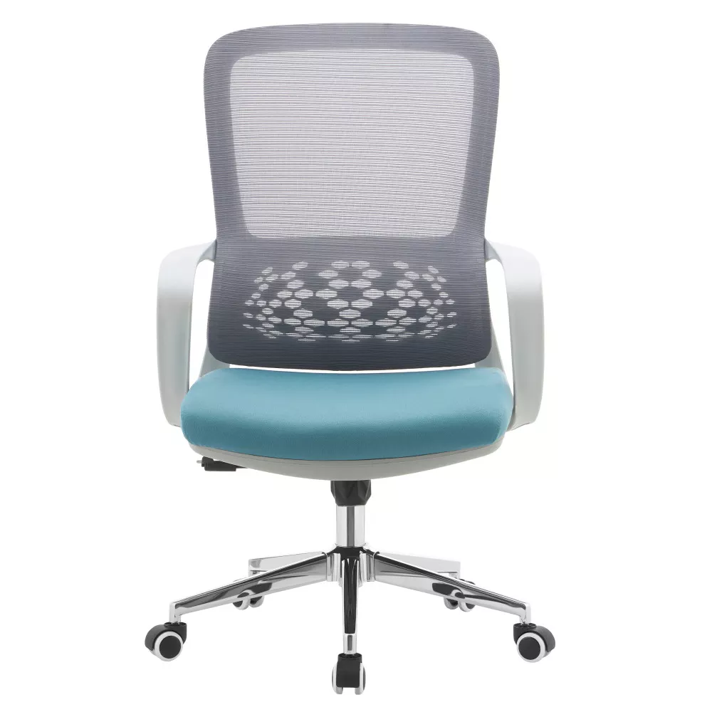Kreslo kombinuje priedušnú šedú sieťovinu s modrou látkou a elegantnou chrómovou podstavou. Ergonomicky tvarovaná bedrová opierka podporuje správne držanie tela a pomáha odľahčiť chrbtici počas celodenného sedenia. Vďaka nastaviteľnému sedu a funkcii hojdania si stoličku ľahko prispôsobíte podľa svojich potrieb.