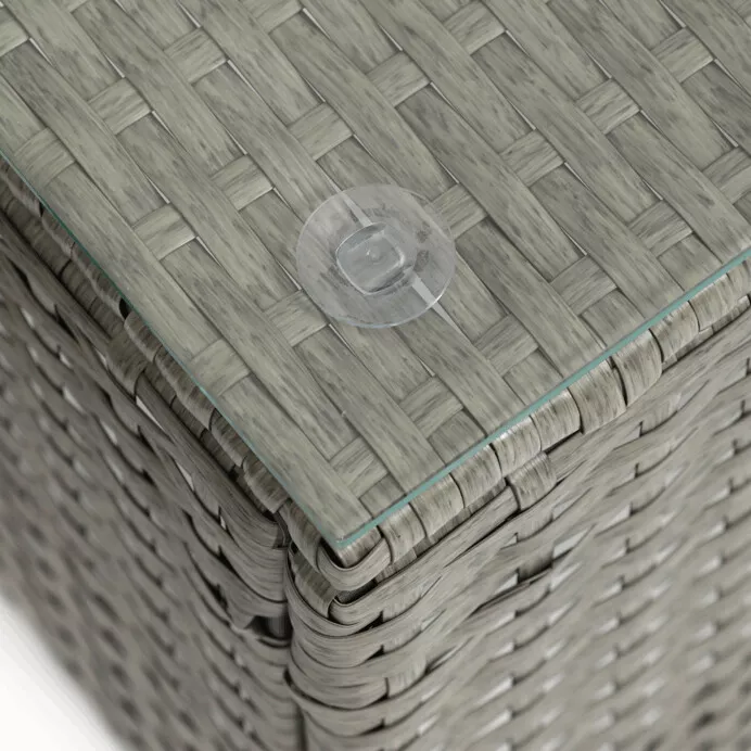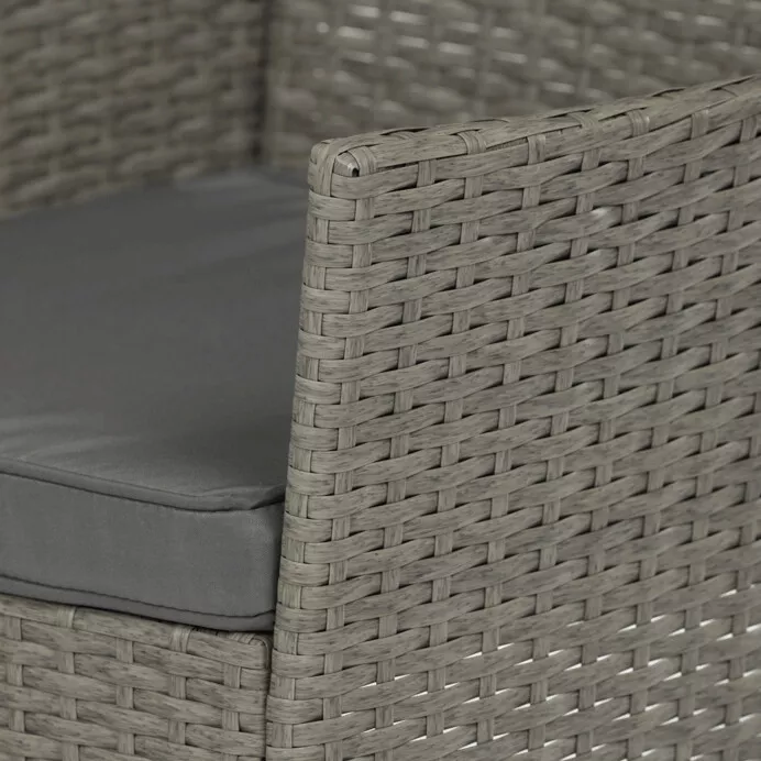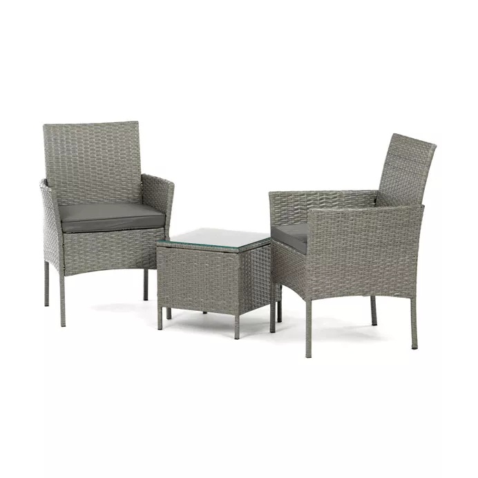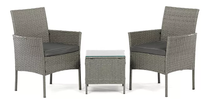 Pevná kovová konštrukcia zaisťuje stabilitu a dlhú životnosť. Výplet z umelého ratanu (polyratan) verne imituje prírodný materiál, pritom je nenáročný na údržbu a vhodný na vonkajšie použitie. Súčasťou setu sú dve pohodlné kreslá s polstrovanými sedákmi v šedej farbe , ktoré zvyšujú komfort pri sedení. Stolová doska z tvrdeného skla je odolná voči poškriabaniu a ľahko sa čistí.