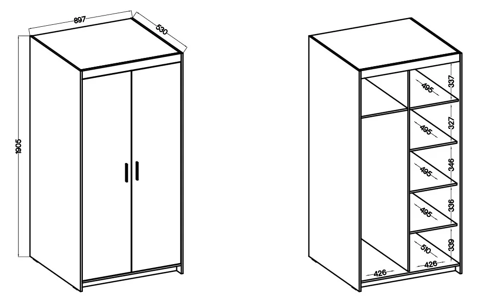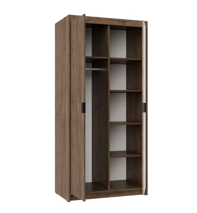 Šatníková skriňa Enja 2D je praktická skriňa so šírkou 90 cm, ktorá ponúka prehľadné usporiadanie pre zavesené aj zložené oblečenie. Vďaka kombinácii šatníkovej tyče a políc sa hodí do spálne, predsiene i detskej izby - všade tam, kde chcete mať veci upratané a dobre dostupné. Vnútri nájdete celkom 5 políc, ktoré uľahčia organizáciu oblečenia, bielizne, krabíc alebo doplnkov.