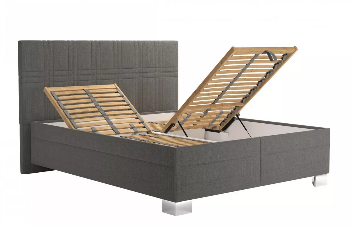 Veľkou výhodou je, že súčasťou postele sú rovno dva lamelové rošty s mechanickým polohovaním - pohodlne si nastavíte 7 polôh hlavy a 1 polohu nôh. Rošt tvorí 28 lamiel vo výkyvných kaučukových puzdrách, má popruh proti preťaženiu av bedrovej časti umožňuje nastavenie tuhosti pre lepšiu oporu chrbta. Úložný priestor sa otvára od nôh pomocou plynových piestov, takže sa k nemu dostanete ľahko a bez námahy.