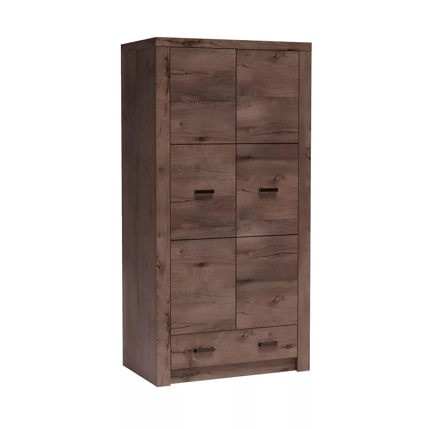 Konštrukcia skrine je vyrobená z kombinácie kovu a drevotriesky , čo zaisťuje pevnosť, stabilitu a dlhú životnosť. Vnútorné usporiadanie je riešené kombináciou policovej a vešiakovej časti, vďaka čomu poskytuje dostatok priestoru na uloženie oblečenia. Praktické zásuvky umožňujú prehľadné uloženie menších vecí, ako je spodná bielizeň, doplnky alebo drobnosti.