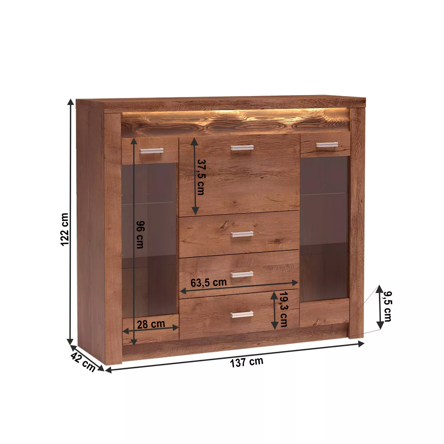 Komoda ponúka premyslené vnútorné usporiadanie, ktoré kombinuje zásuvky, police aj uzavretý priestor za dvierkami . Tri zásuvky poskytujú ideálne miesto na uloženie drobnejších predmetov, zatiaľ čo skrinková časť s policami umožňuje prehľadné uloženie väčších vecí. Vyklápacie dvierka v ornej časti komody pridávajú moderný vzhľad a zároveň zaisťujú ľahký prístup k uloženým predmetom.