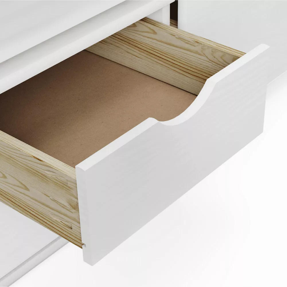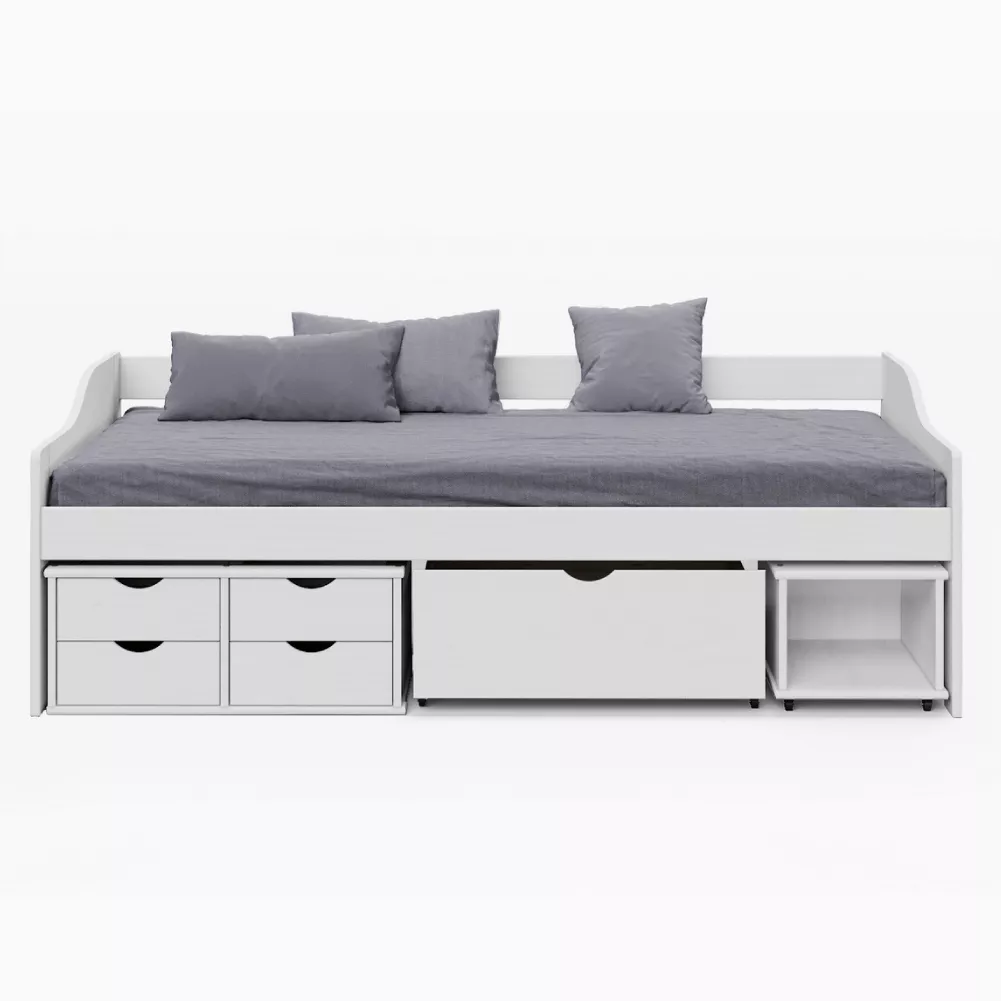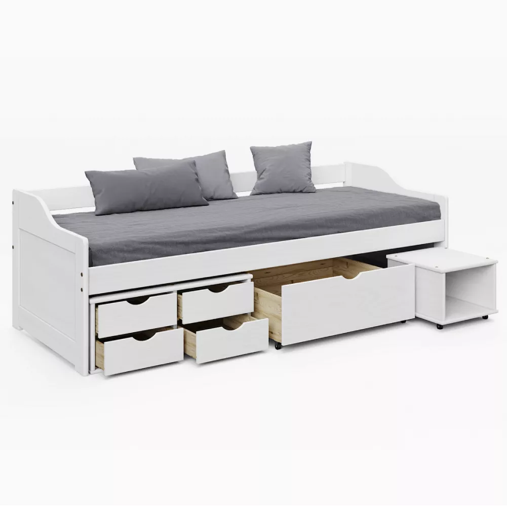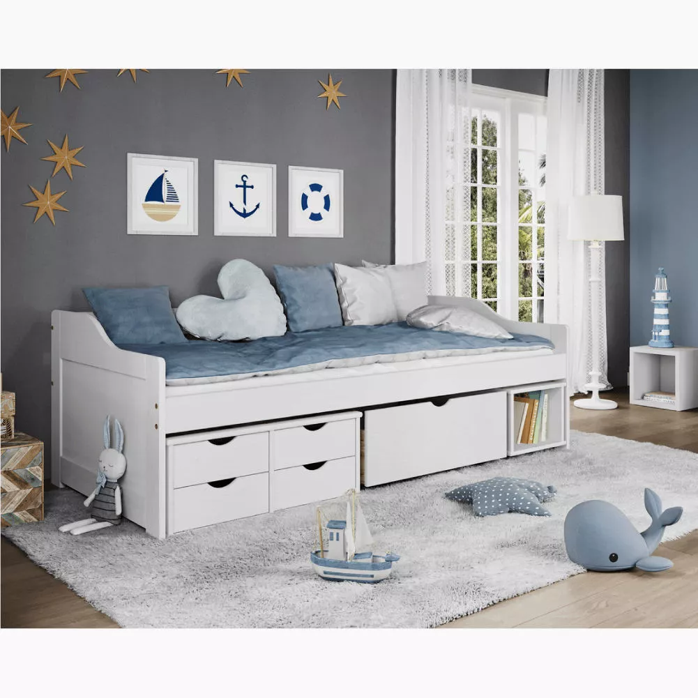 Posteľ MAXI NEW je praktickým riešením pre detskú aj študentskú izbu, kde je potrebné efektívne využiť každý centimeter priestoru. Biele prevedenie z masívu pôsobí čisto, moderne a ľahko sa kombinuje s ďalším nábytkom.