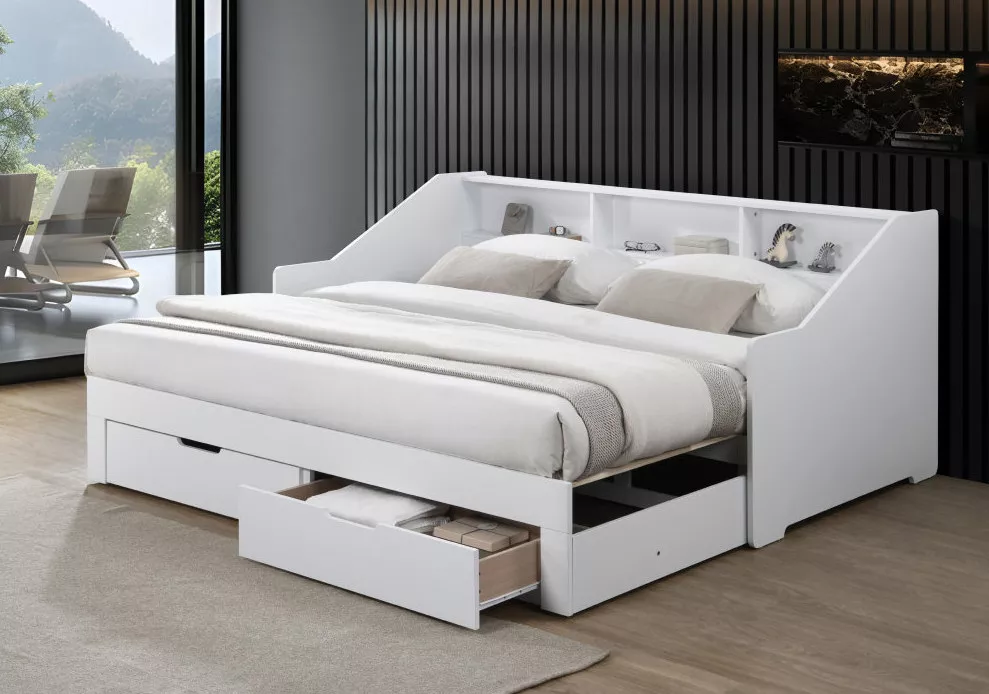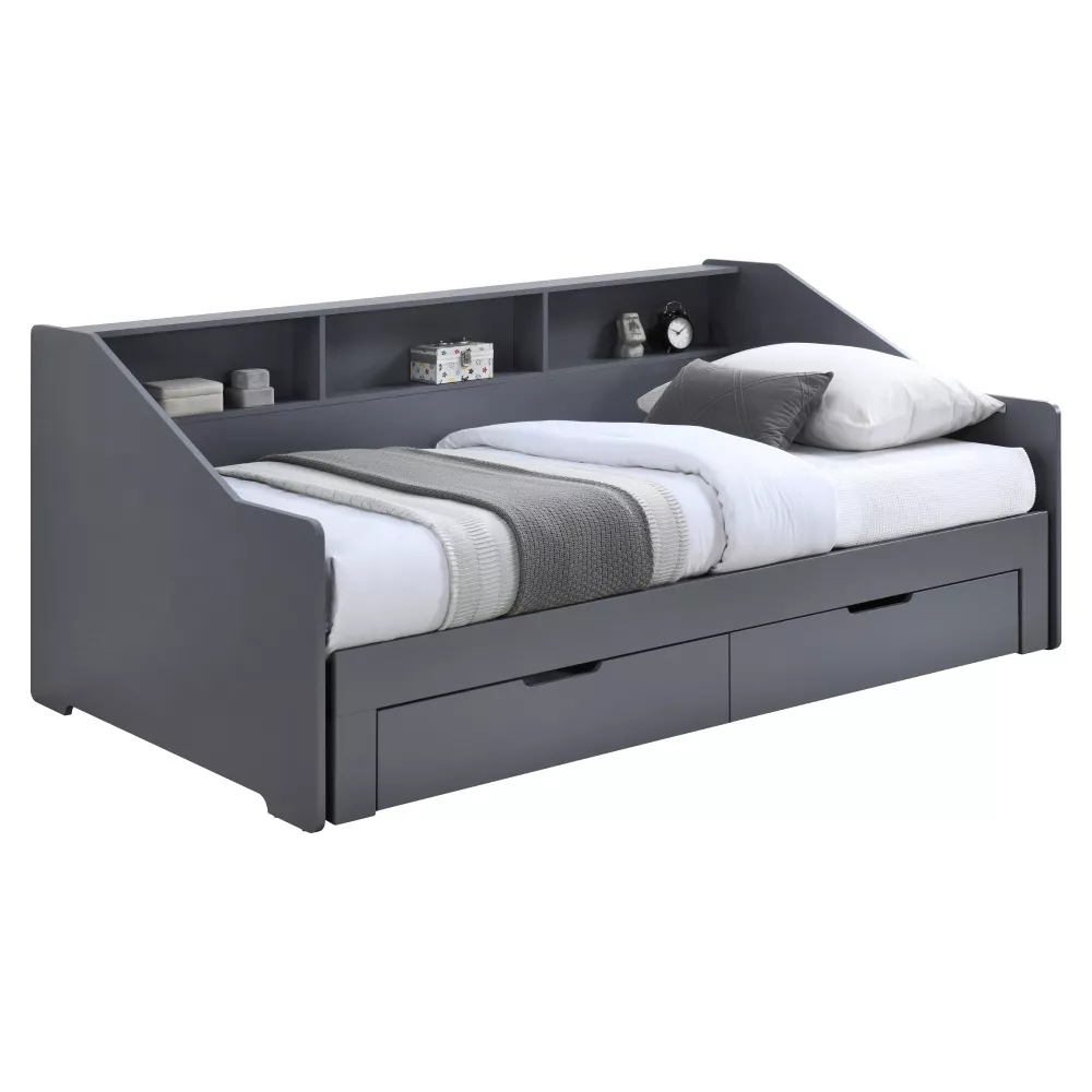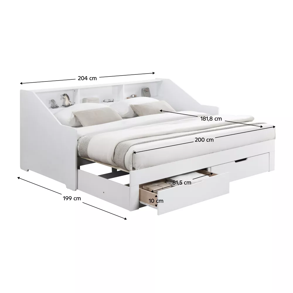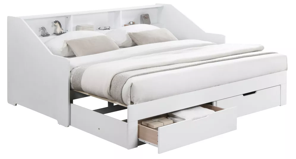 Praktickú stránku dopĺňajú dve zásuvky, ktoré poskytujú úložný priestor pre lôžkoviny, oblečenie alebo hračky. Vyvýšená bočnica zároveň chráni stenu a obsahuje tri otvorené police, ideálne na knižky, dekorácie alebo drobnosti, ktoré chcete mať po ruke.