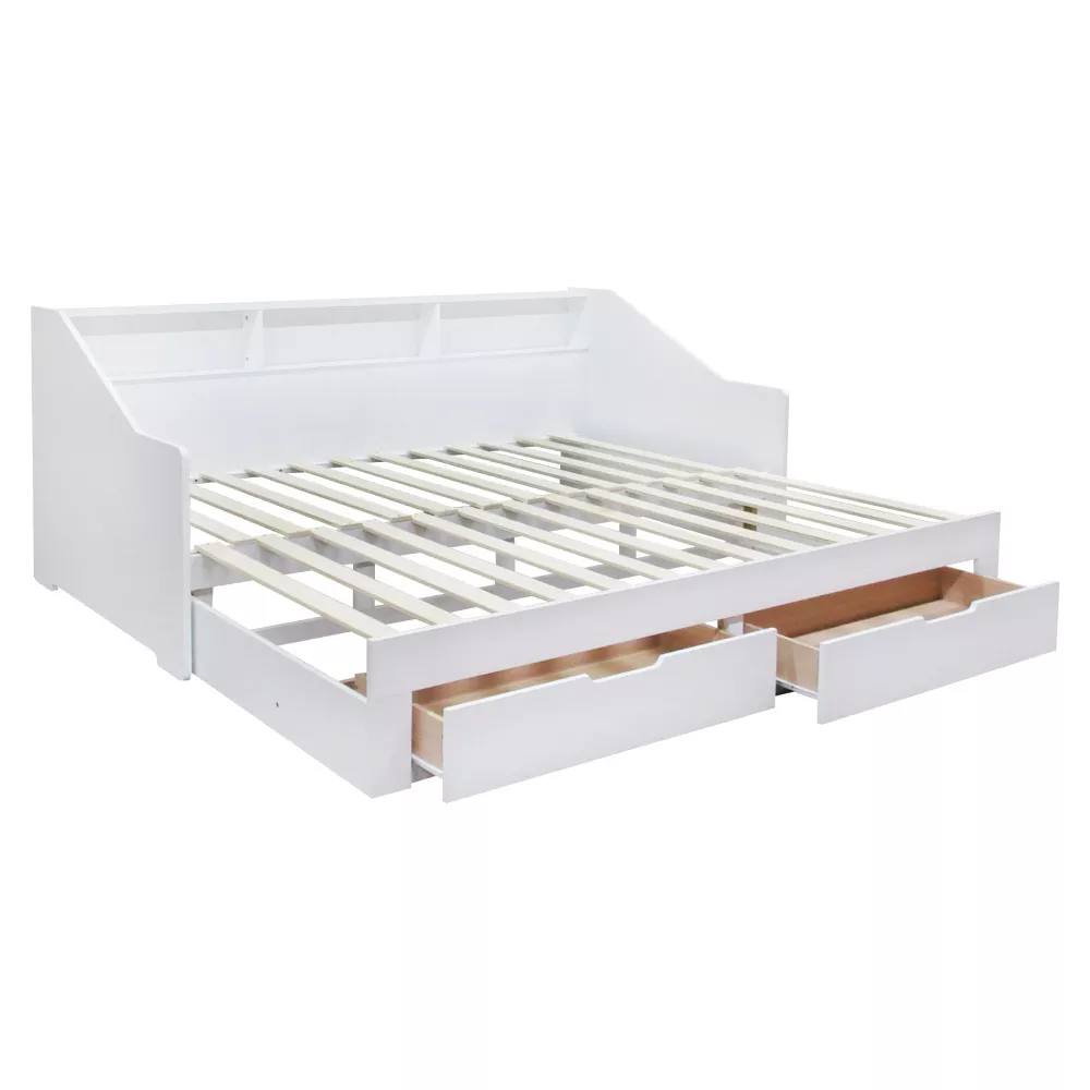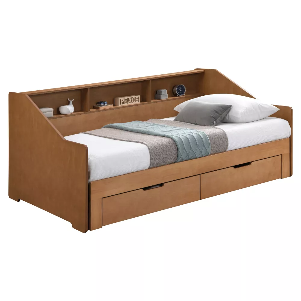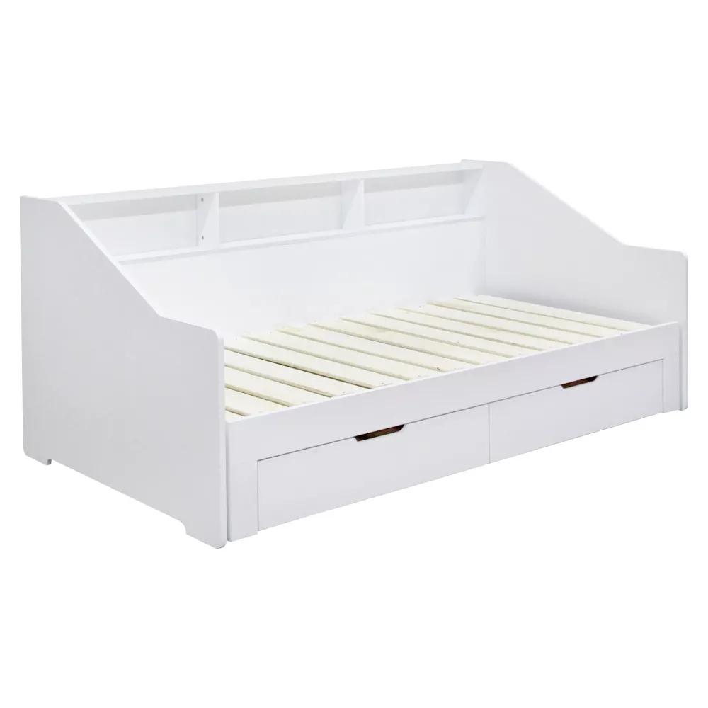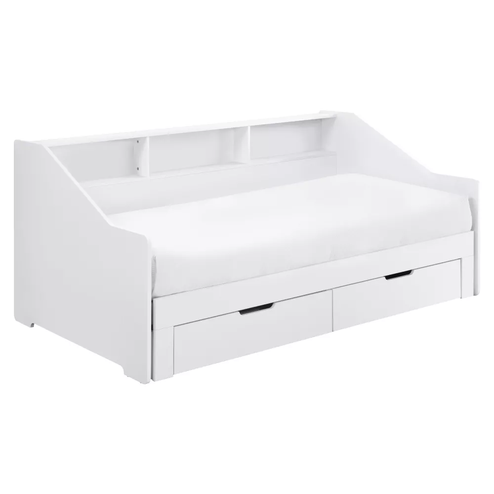 Praktickú stránku dopĺňajú dve zásuvky, ktoré poskytujú úložný priestor pre lôžkoviny, oblečenie alebo hračky. Vyvýšená bočnica zároveň chráni stenu a obsahuje tri otvorené police, ideálne na knižky, dekorácie alebo drobnosti, ktoré chcete mať po ruke.