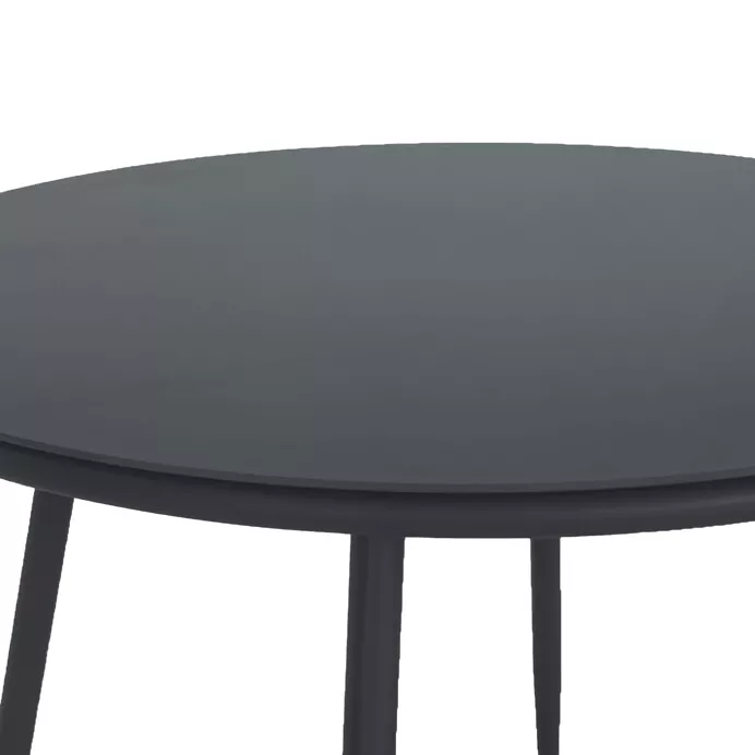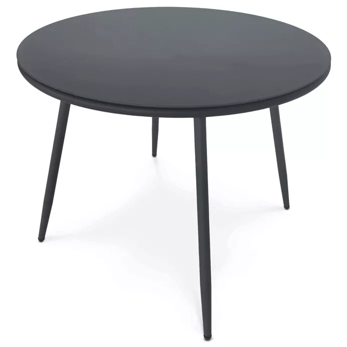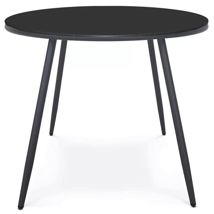 Doska z tvrdeného skla v šedom odtieni je pevná, ľahko sa čistí a dobre odoláva bežným vonkajším podmienkam. Kovová podnož so štyrmi štíhlymi nohami zaisťuje stabilitu a zároveň dodáva stolu ľahký a nadčasový charakter, ktorý sa ľahko kombinuje s rôznymi typmi záhradných stoličiek.