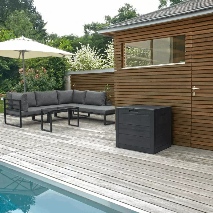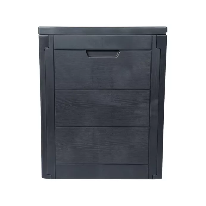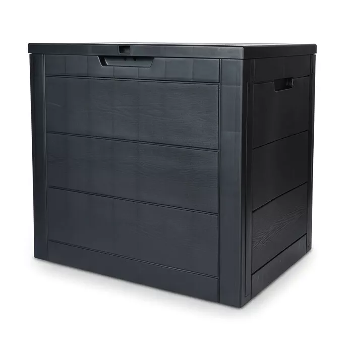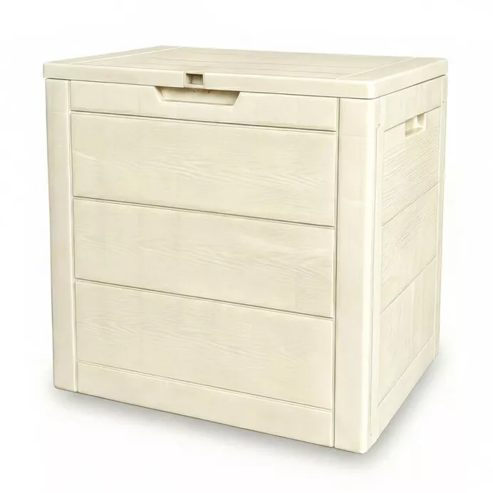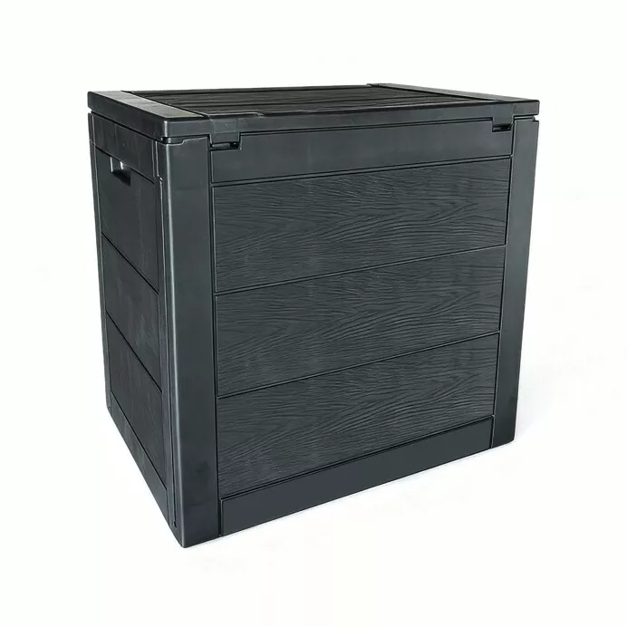 Box je vyrobený z pevného plastu , ktorý je odolný voči bežným poveternostným vplyvom a zároveň nenáročný na údržbu. Povrch má jemnú textúru pripomínajúcu drevo, čo boxu dodáva príjemný prírodný vzhľad. Veko je vybavené bezpečným uzáverom, ktorý pomáha chrániť uložené veci pred prachom a vlhkosťou. Praktické bočné úchyty uľahčujú prenášanie a manipuláciu.
