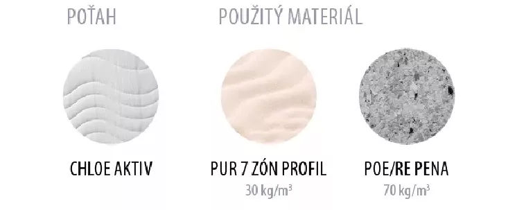 Matrac je z oboch strán tvrdý s nosnosťou do 120 kg. Poťah, ktorý je na zips, je možné prať na 60 °C . Táto matraca má poťah Chloe Aktiv , ktorý je: