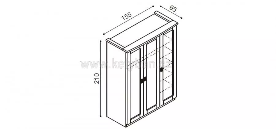 Táto trojdverová skriňa so zrkadlom na prostredných dverách z radu Rebeka sa vyrába v rozmeroch 65x155x210 cm. Vnútri je päť políc a dlhá šatníková tyč pre zavesenie oblečenia.