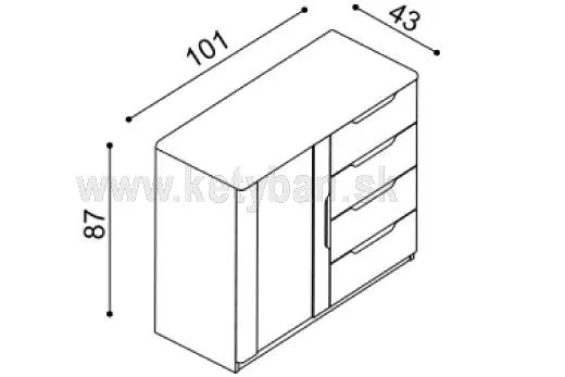 Komoda Flab 2DZ4. Komoda obsahuje jedny dvierka štyri melé zásuvky. Výška komody je 87 cm, dĺžka je 101 cm a šírka 43 cm. Kolekcia Flab ...