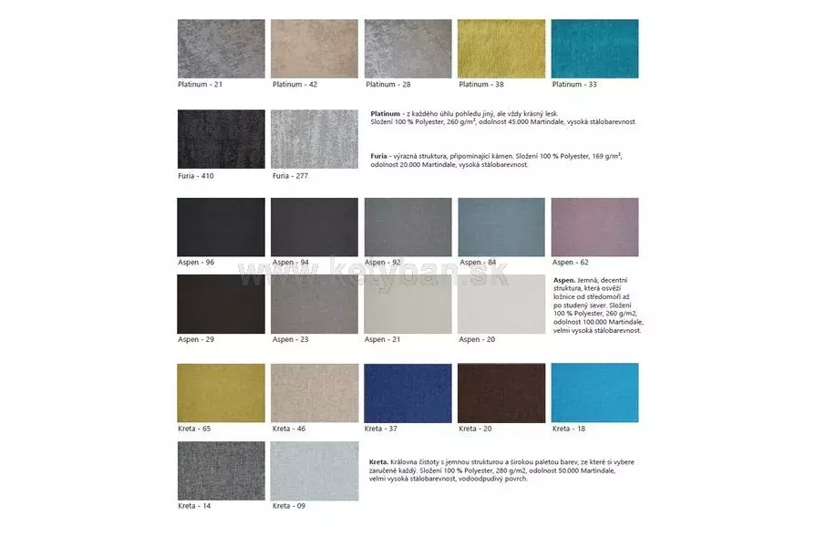 Posteľ ponúkame v širokej palete látok s dlhou životnosťou a ľahkou údržbou. Možnosť použitia rozdielne látky na spodnú časť postele. Zároveň môžete zvoliť typ a výšku nožičiek.