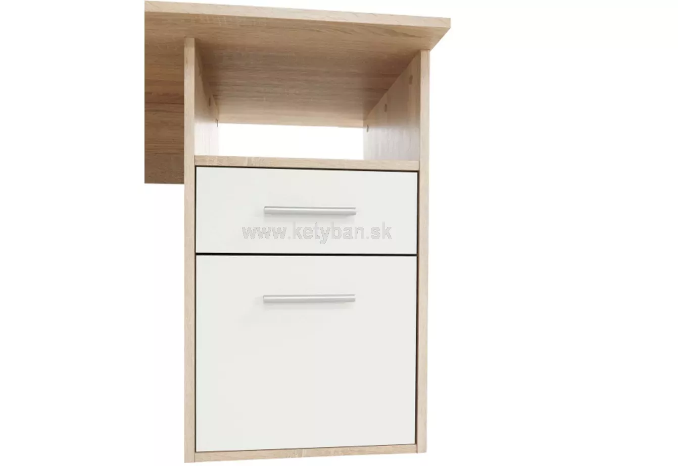 Dve pracovnej plochy poskytujú dostatok priestoru pre elektorniku, dekoráciu a prácu. Dlhšia strana je o rozmere viac ako 2m a kratšie 1,7m. V jedná časti nájdete šuplík a skrinku, ktorá je rozdelená na dve časti a ponúka uzavretú odkladaciu plochu.