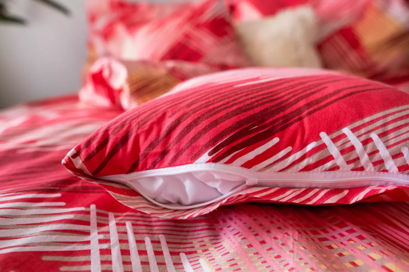 Červené obliečky s abstraktnými motívmi na pokojný spánok.